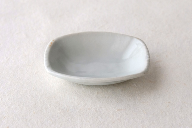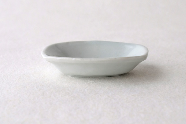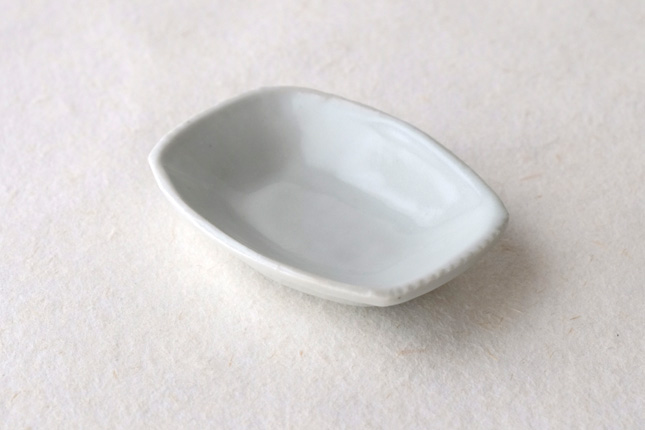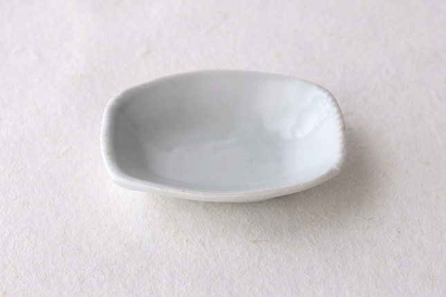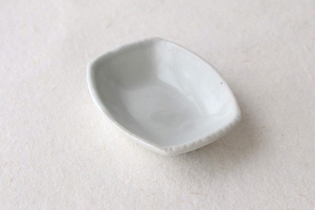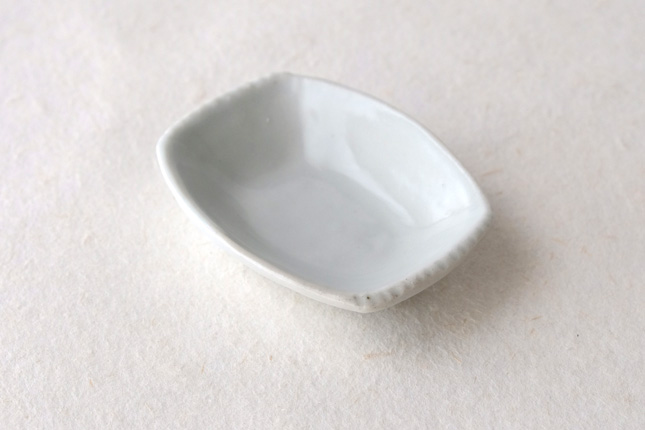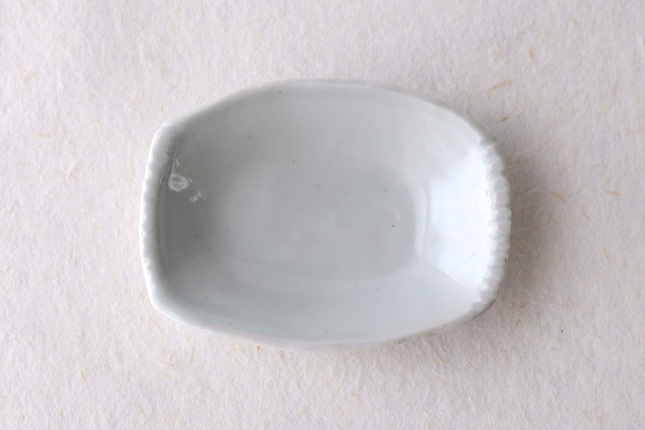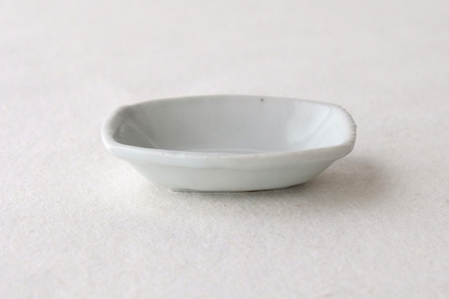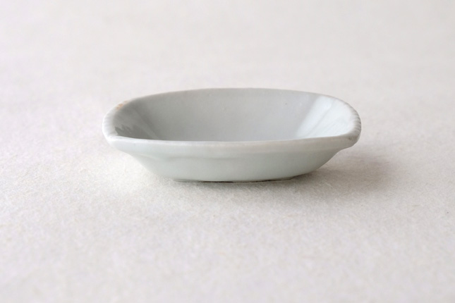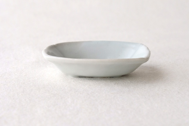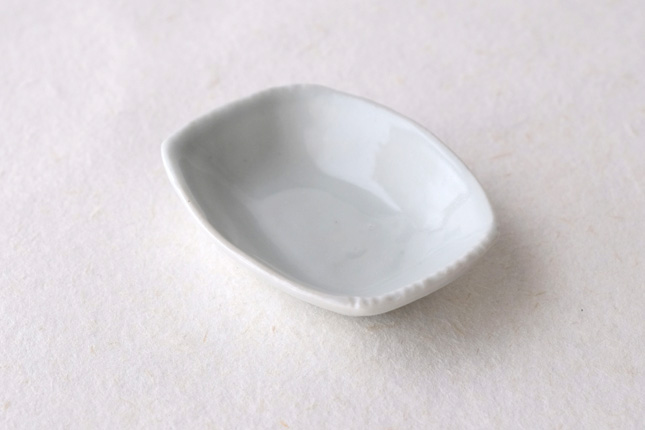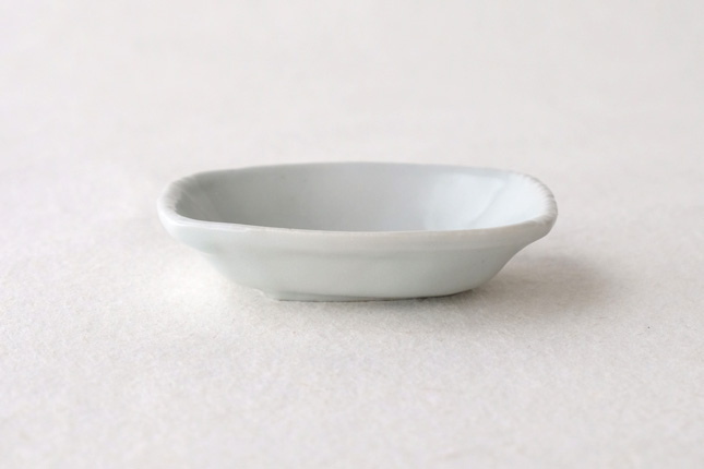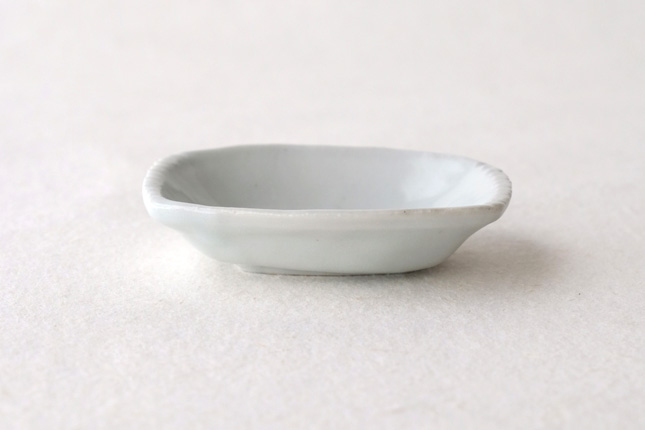 軽やかな印象の手塩皿。両端がギザギザになっているのは、お二人の最近の流行りなのだとか。もともとはレンゲを置くために作られた形なのだそうです。醤油や薬味など日々気軽にお使いいただきやすいかと思います。