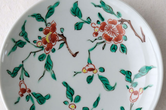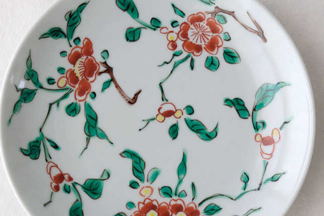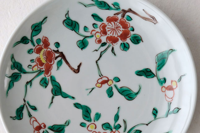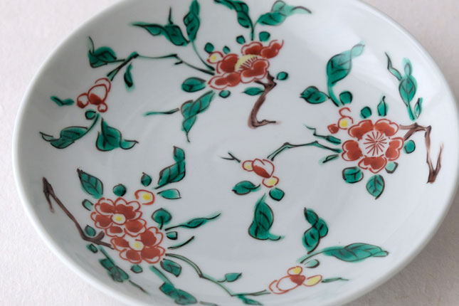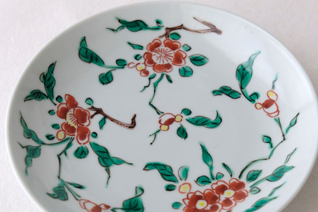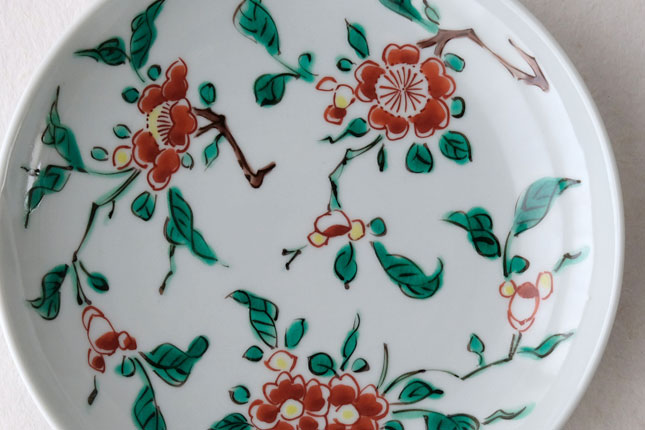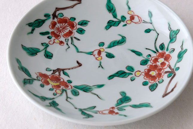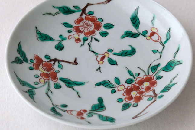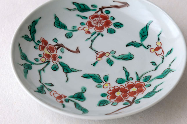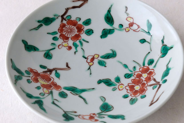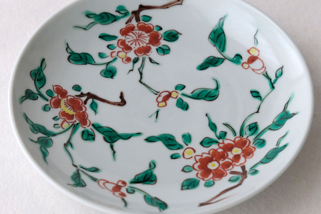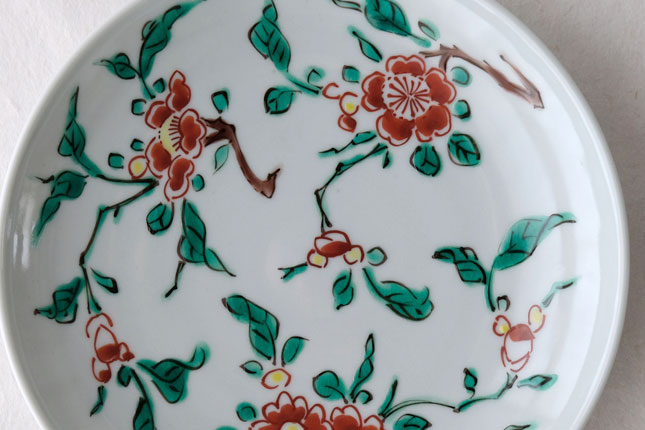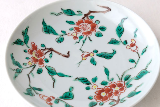 色絵の華やかな赤い花と葉の緑が、地味めのおかずを引き立ててくれます。