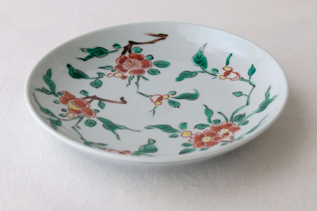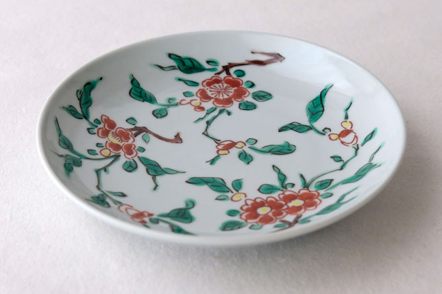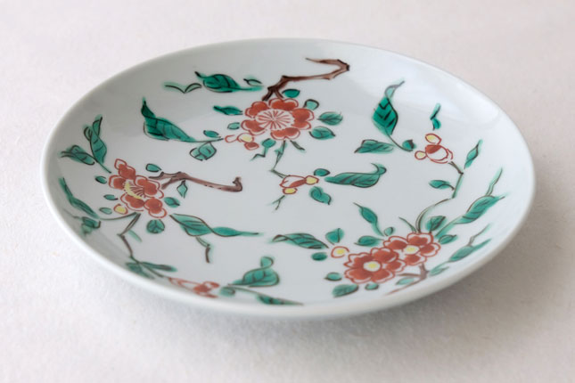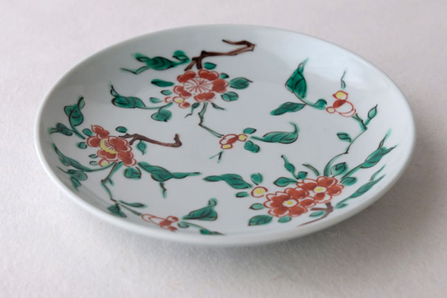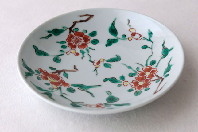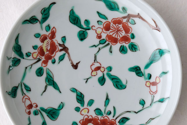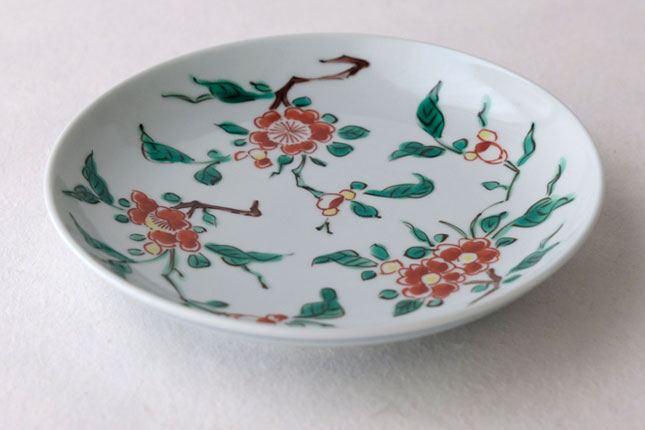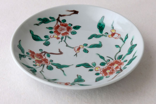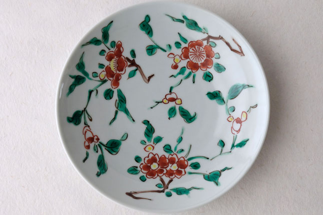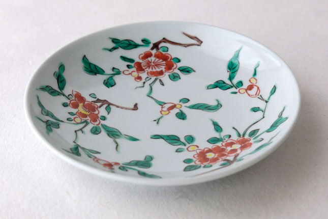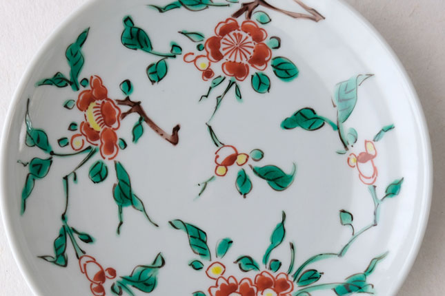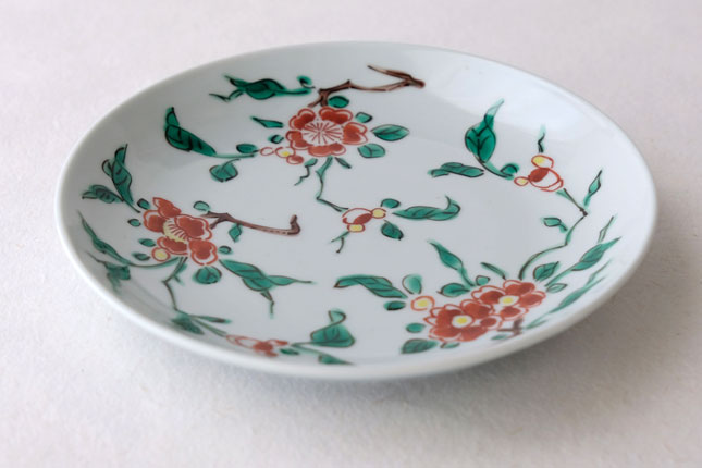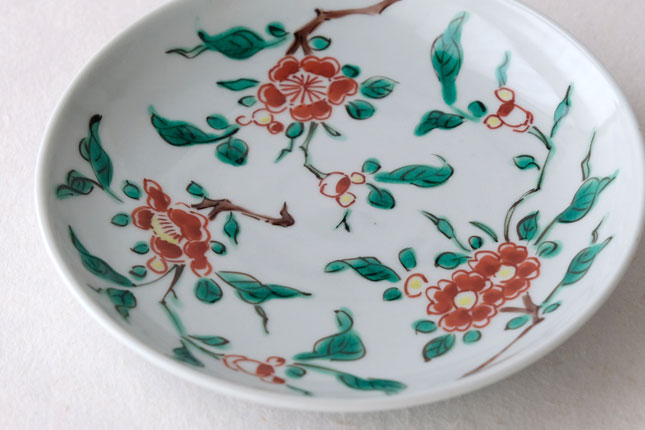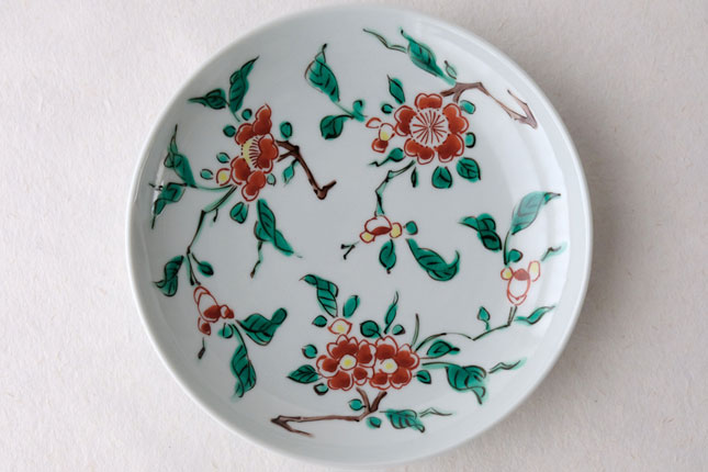 色絵の華やかな赤い花と葉の緑が、地味めのおかずを引き立ててくれます。