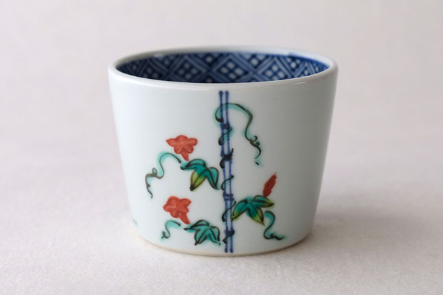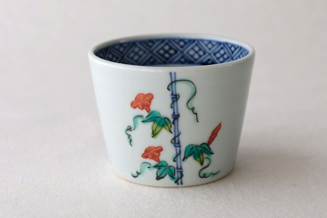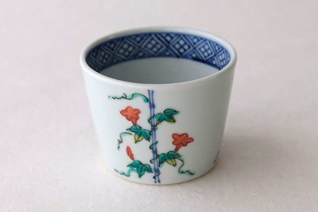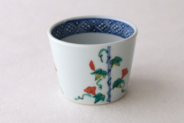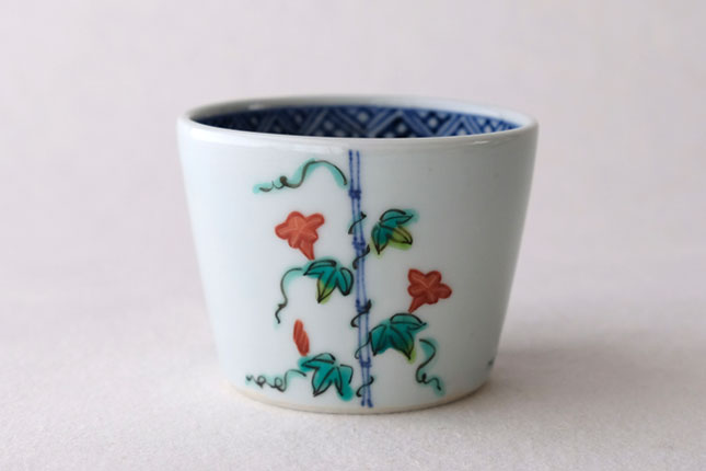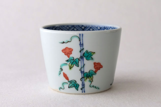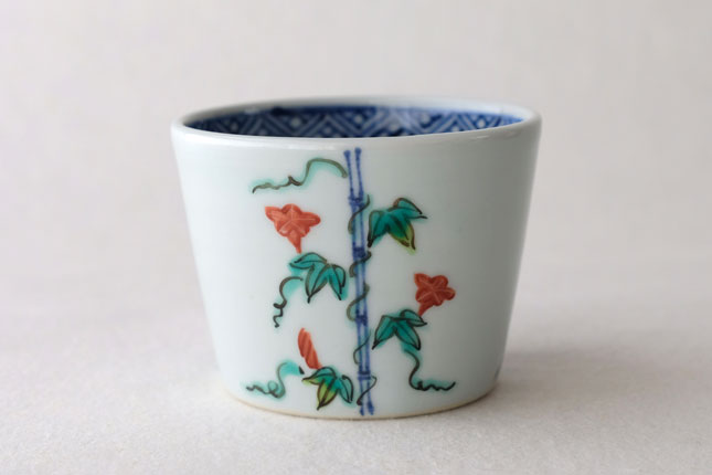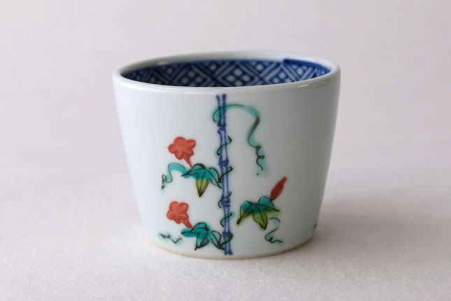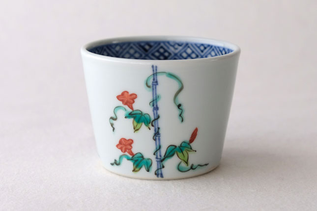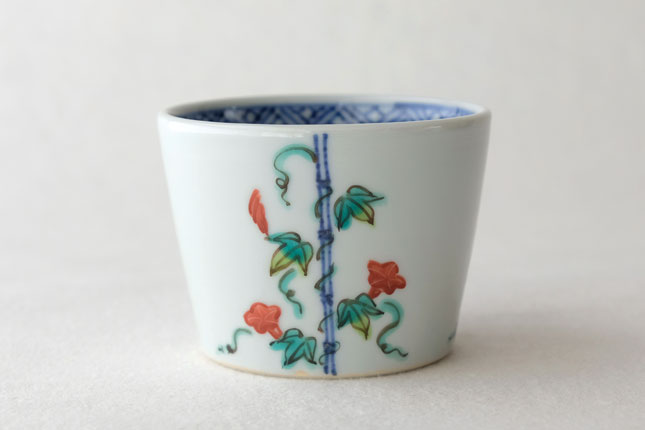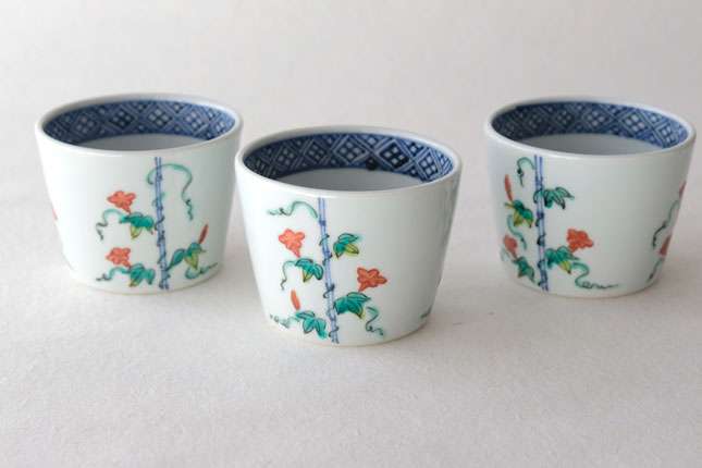 竹竿に巻きついた朝顔がかわいらしいです。花や葉の付き方を変えながら三方向に描かれています。