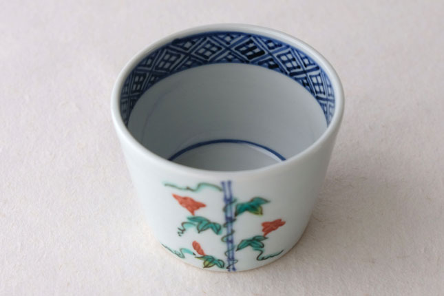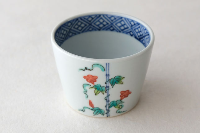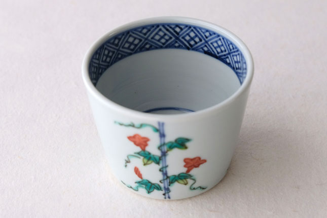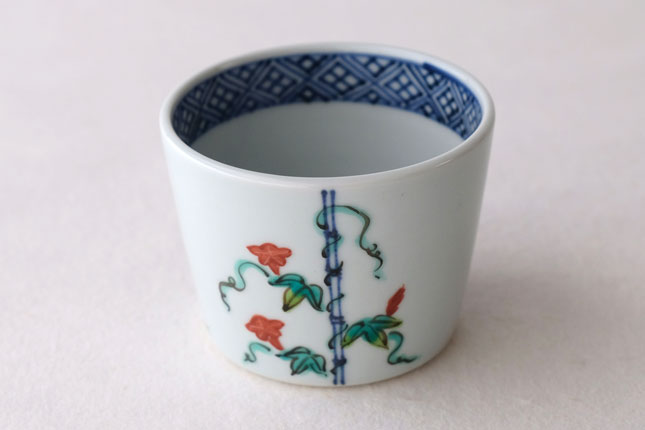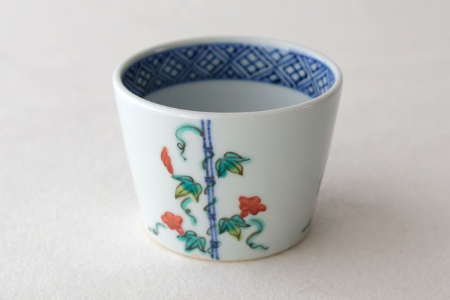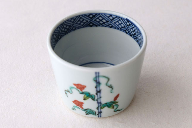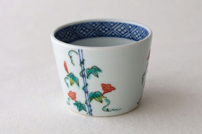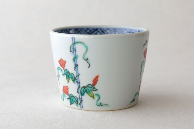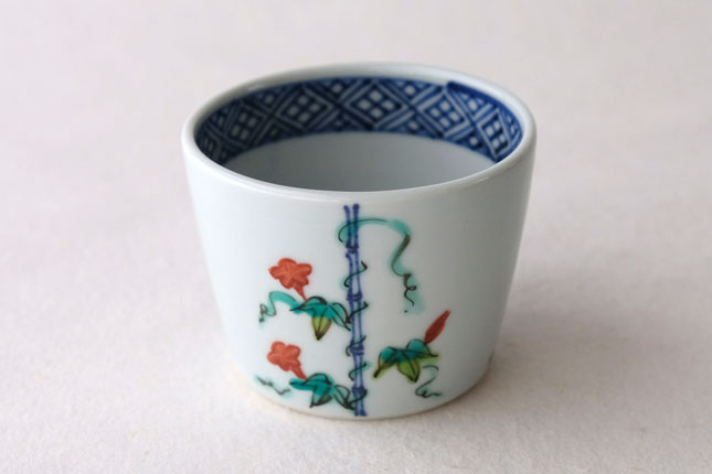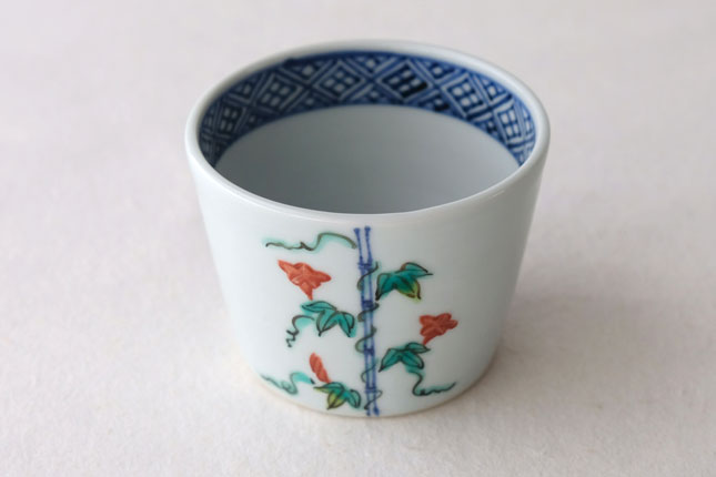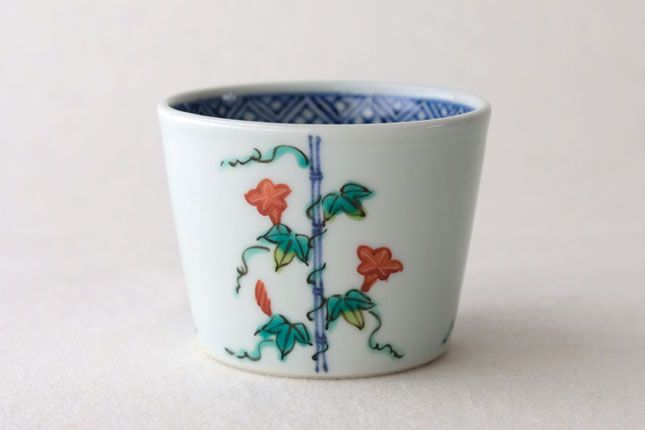 竹竿に巻きついた朝顔がかわいらしいです。花や葉の付き方を変えながら三方向に描かれています。