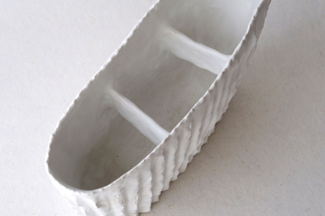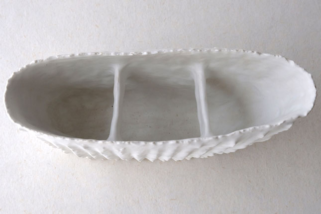 表面がボコボコとしたユニークな形の花器。内側に渡った部分があるので、植物が留まりやすいです。