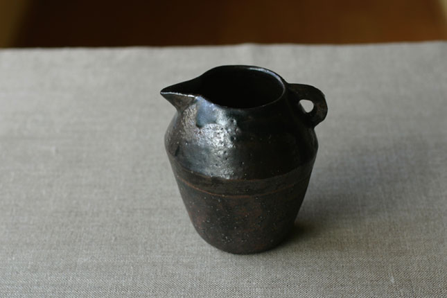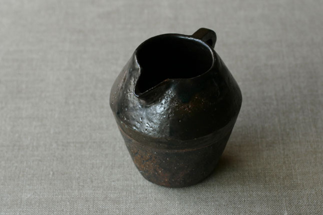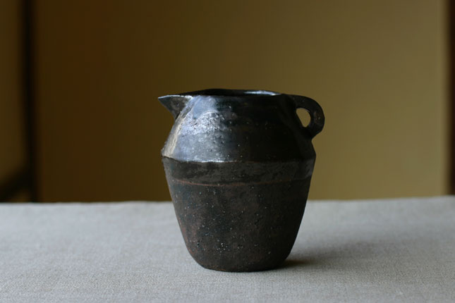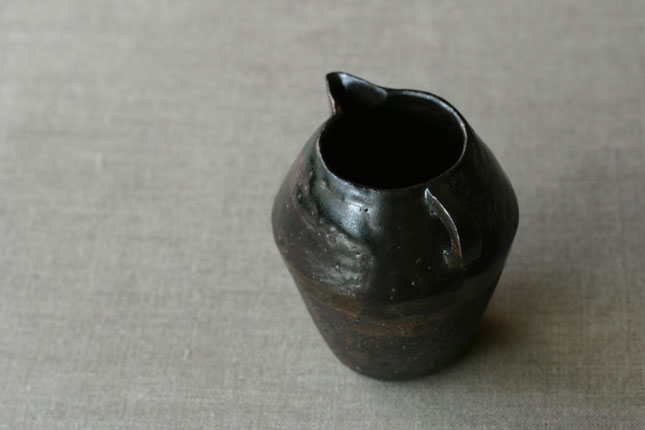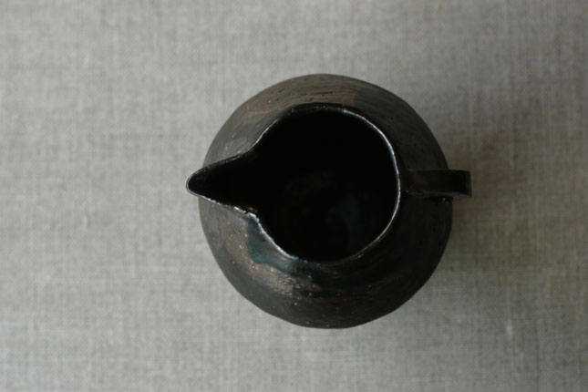 ざらっとした黒に、上部分はつるっとした質感の切り替えし。花器としてお使いいただいても素敵です。