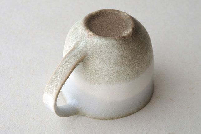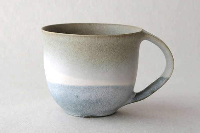 色の変化が美しいマグカップ。グラデーションは器のなかにもあり、飲み物を飲んでいるあいだもずっと楽しんでいただけると思います。型に粘土を押しあてて形を作られています。ご本人は型に押しあてることで生まれる独特のハリ感に惹かれているのだそう。