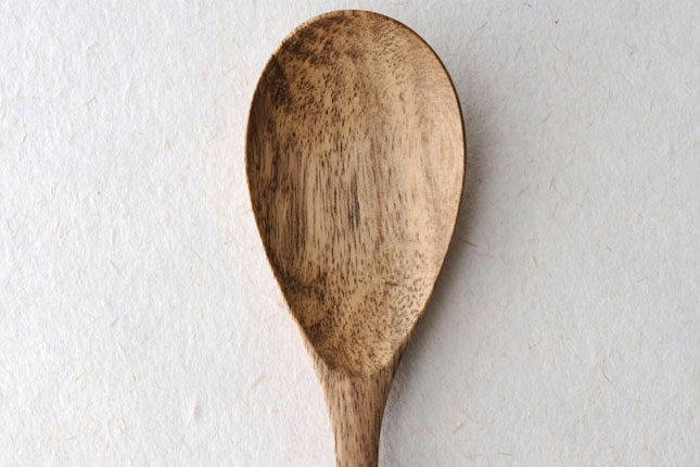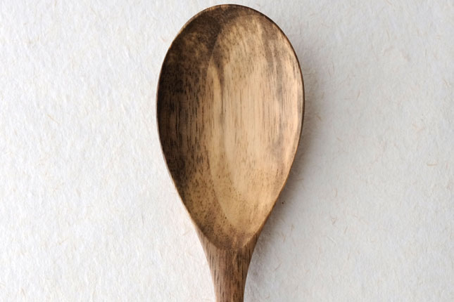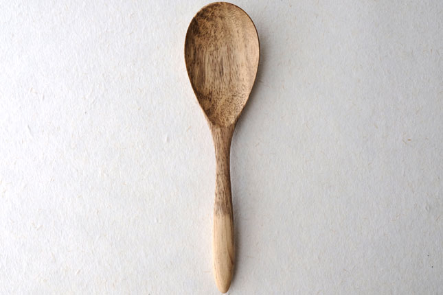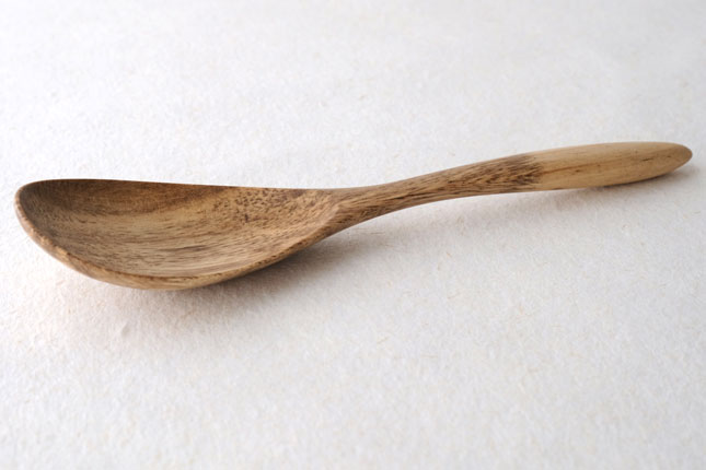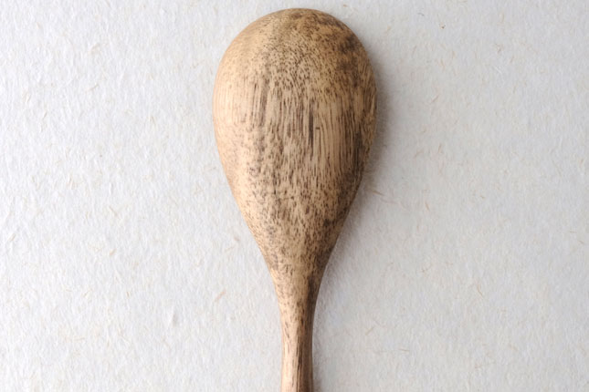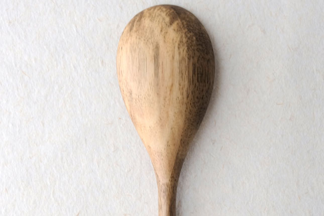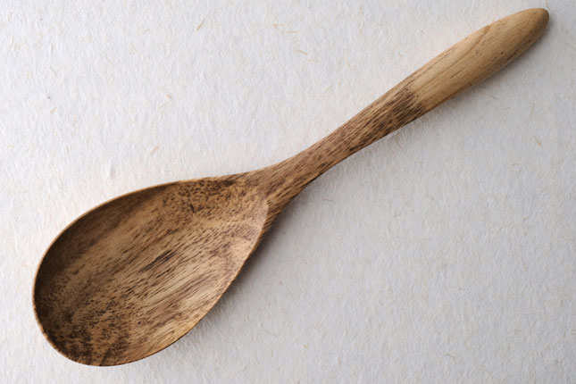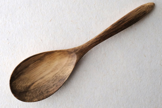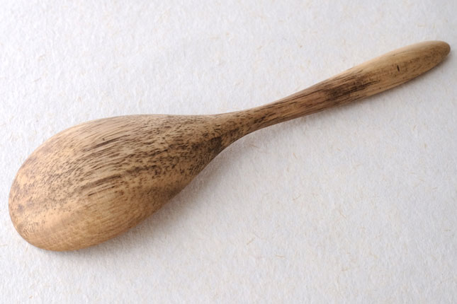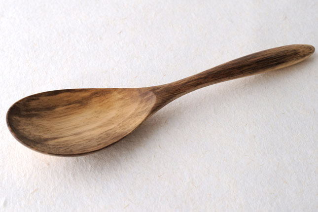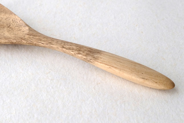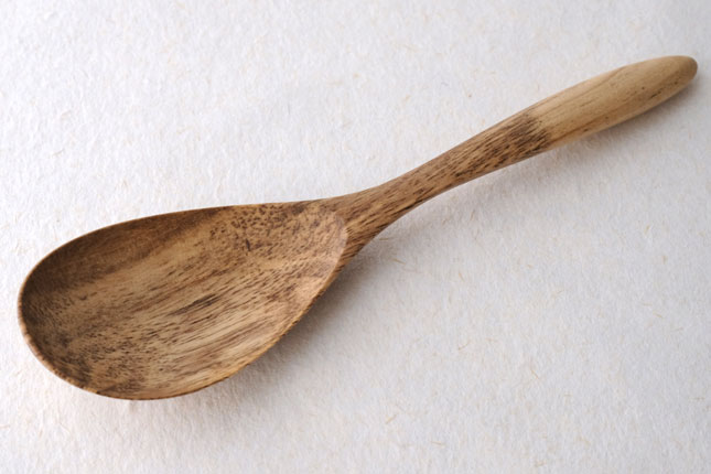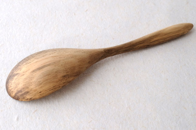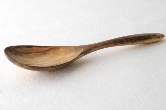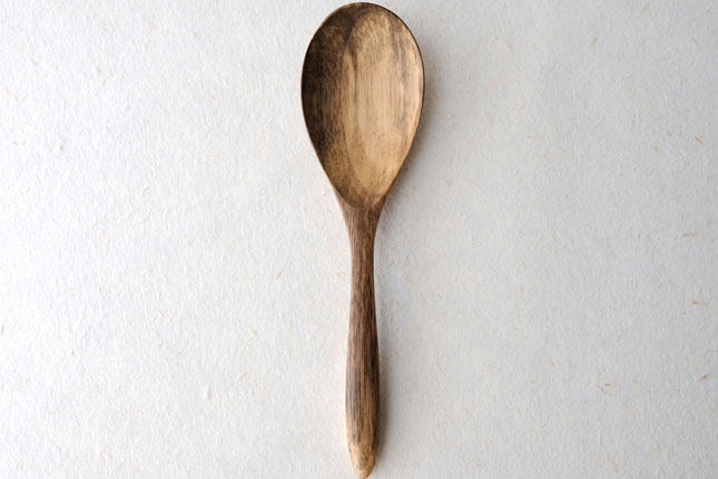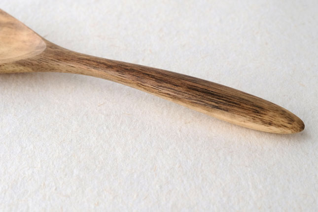 柿の樹に独特の模様がはいったスポルティッドの材で作っていただきました。スポルティッドとは、樹に傷がつき、そこから雨水がしみこむなどして樹の内部に細菌などがはいりこんでできる黒い帯状の模様ができた木材のことをいいます。貴重な材を使って作っていただいたサービングスプーンは、一点一点個性的な模様が出ています。滑らかな質感で、使い心地のよいカトラリーです。取り分け用のスプーンとしてとても使いやすいサイズ。匙の部分の縁が薄くなっているので、料理がすくいやすいです。