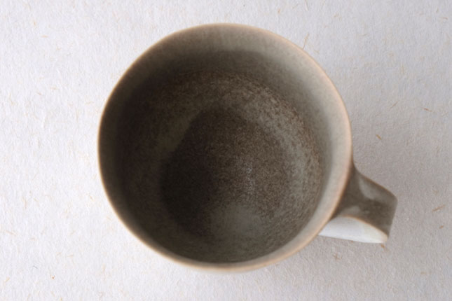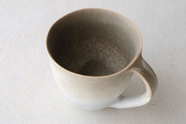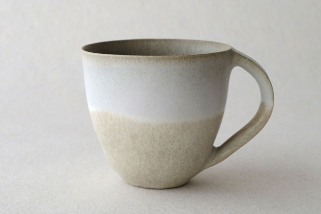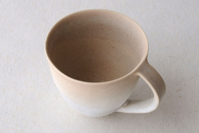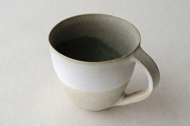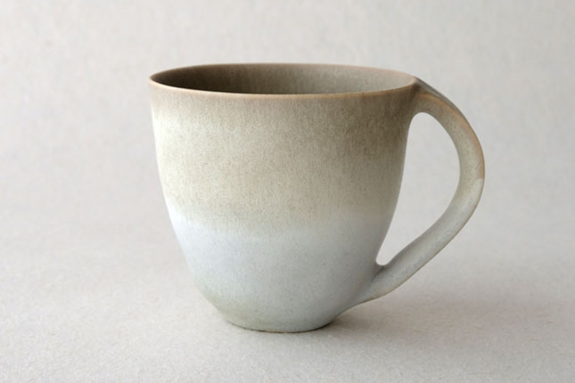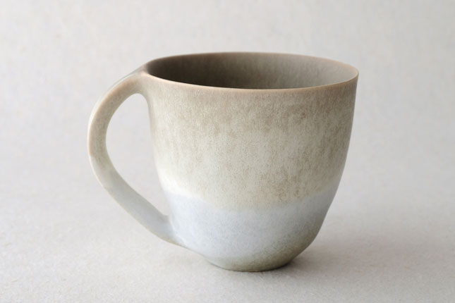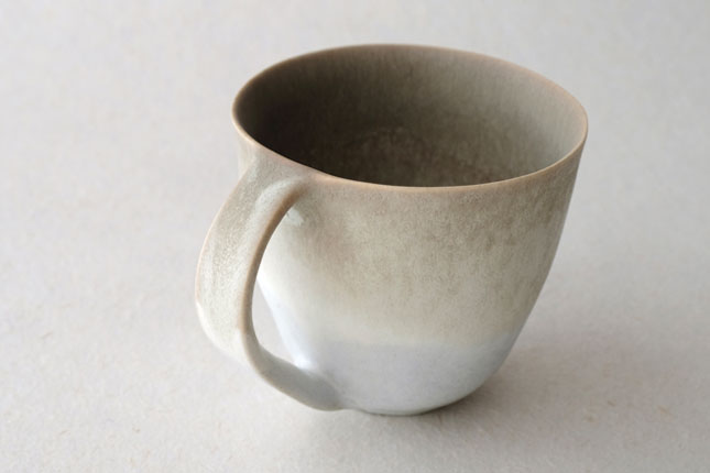 色の変化が美しいマグカップ。グラデーションは器のなかにもあり、飲み物を飲んでいるあいだもずっと楽しんでいただけると思います。型に粘土を押しあてて形を作られています。ご本人は型に押しあてることで生まれる独特のハリ感に惹かれているのだそう。