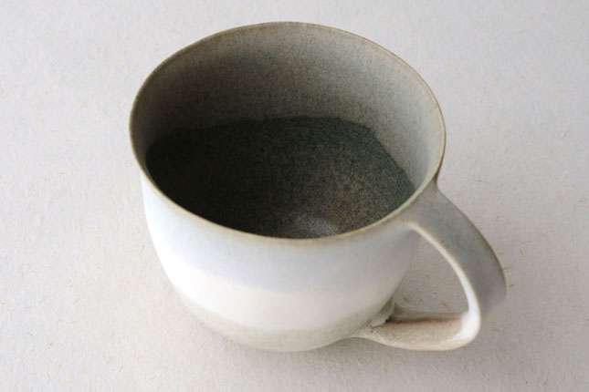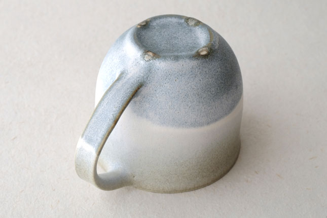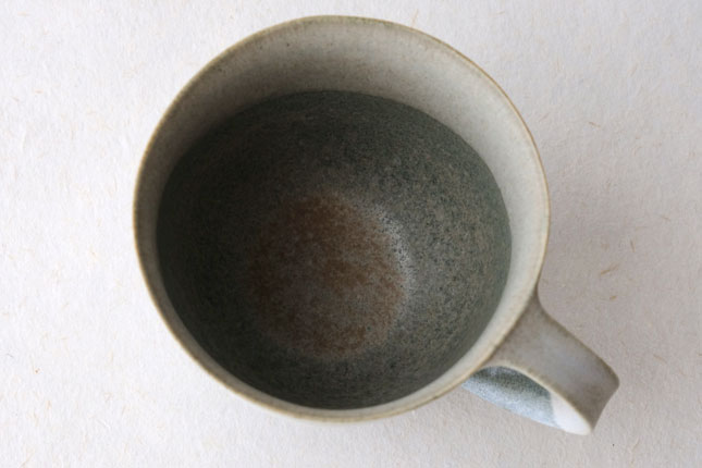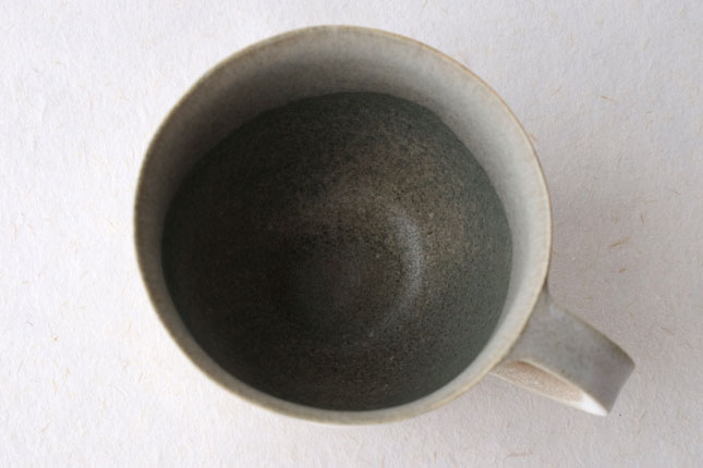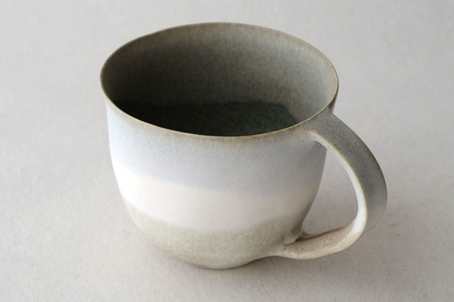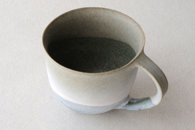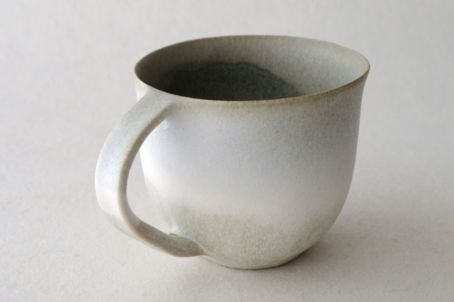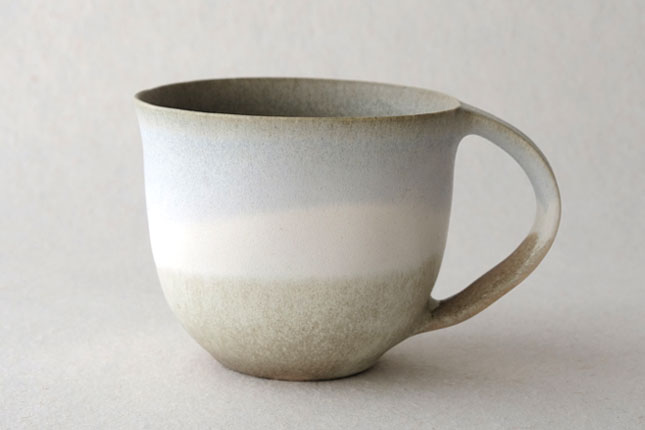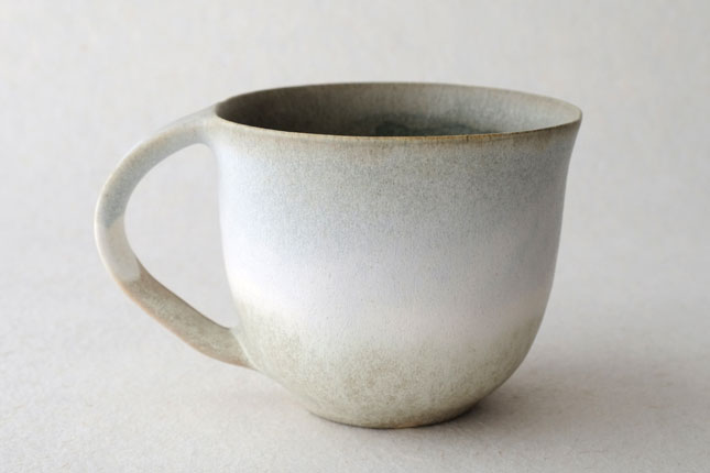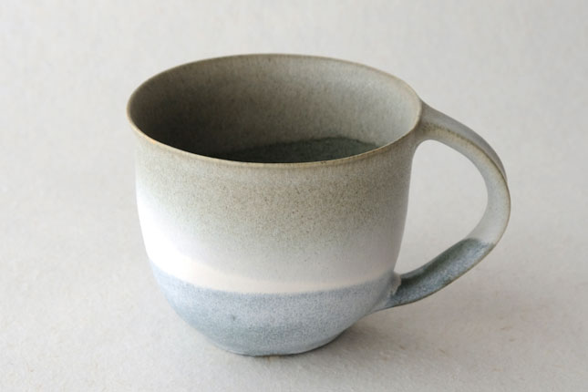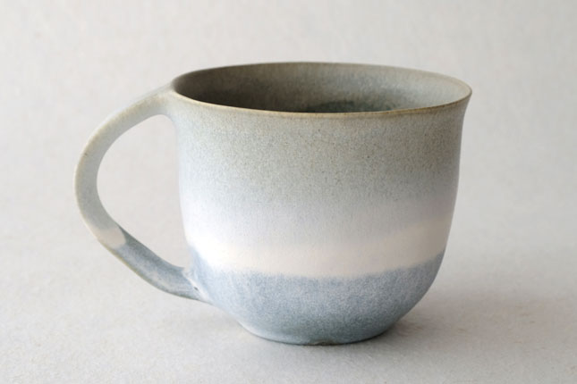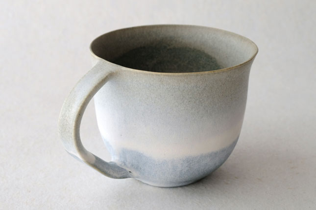 色の変化が美しいマグカップ。グラデーションは器のなかにもあり、飲み物を飲んでいるあいだもずっと楽しんでいただけると思います。型に粘土を押しあてて形を作られています。ご本人は型に押しあてることで生まれる独特のハリ感に惹かれているのだそう。