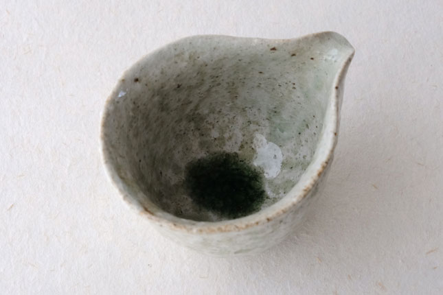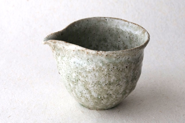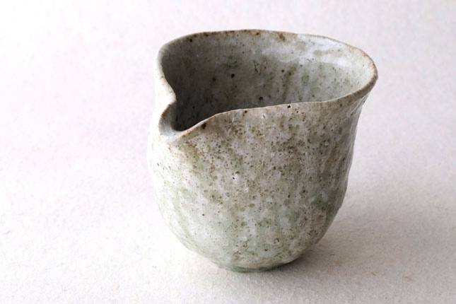 鶴見さんならではの、手びねりの技法をいかした独特の形です。縁の下がすぼまっていて片手でも持ちやすくなっています。お茶の湯冷ましとして、ぐい呑みとあわせて酒器に、ここでタレやドレッシングを作って道具のように使っても。