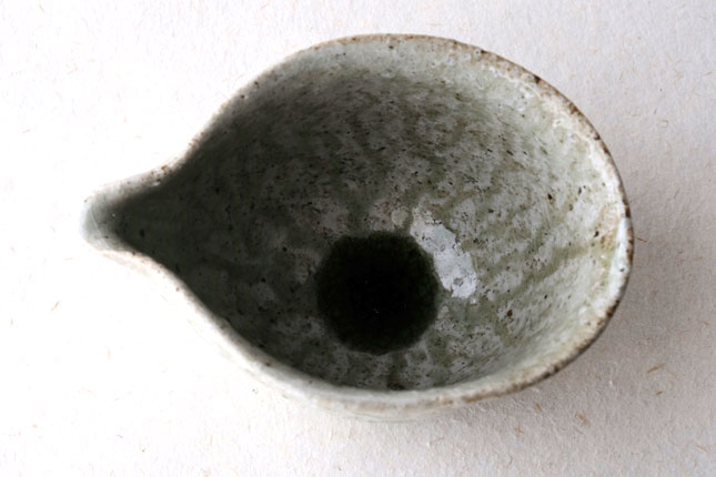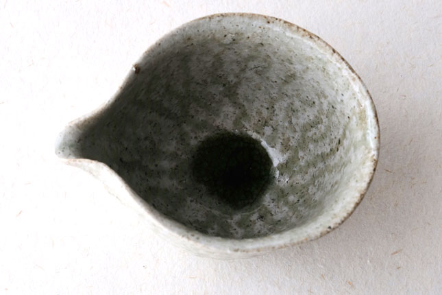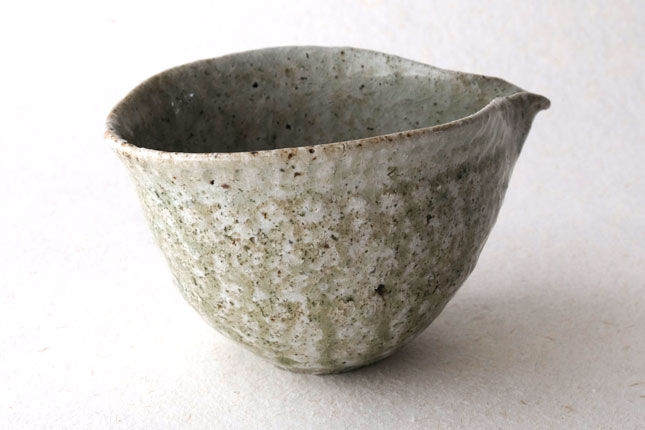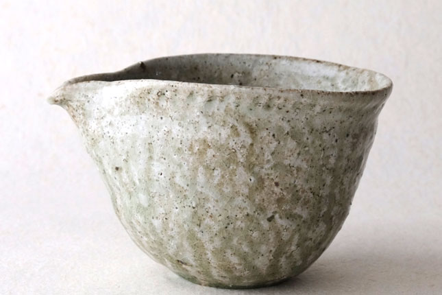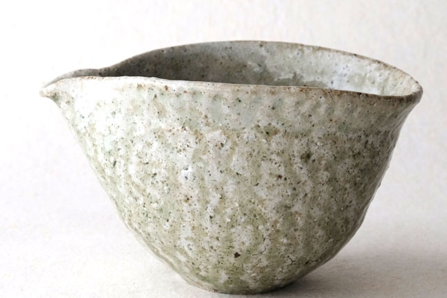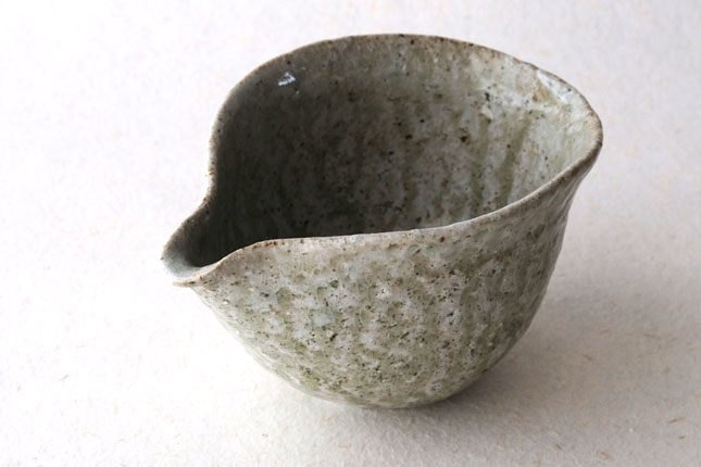 鶴見さんならではの、手びねりの技法をいかした独特の形です。縁の下がすぼまっていて持ちやすくなっています。すこし大きめですが、手の大きい方でしたら片手でも持てると思います。お茶の湯冷ましとして、ぐい呑みとあわせて酒器に、珈琲サーバーのように使っても。