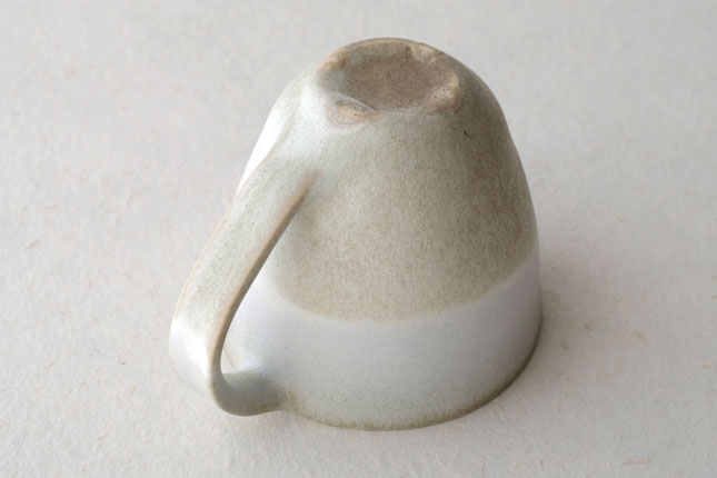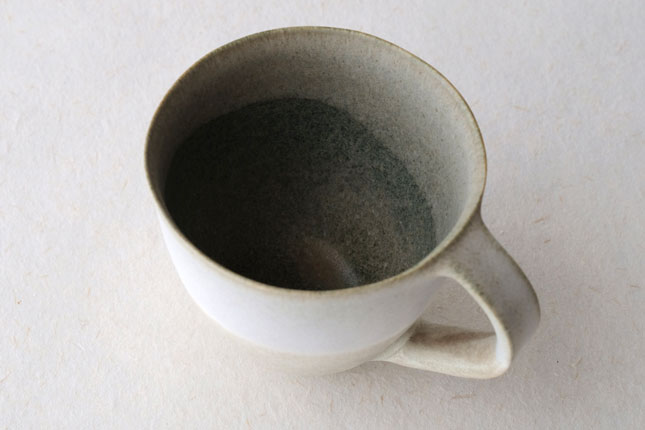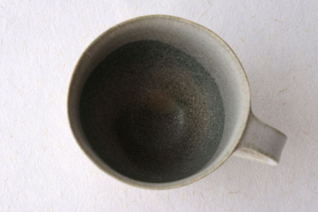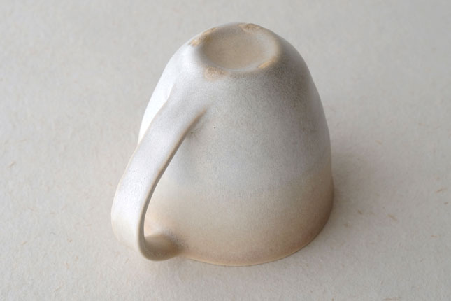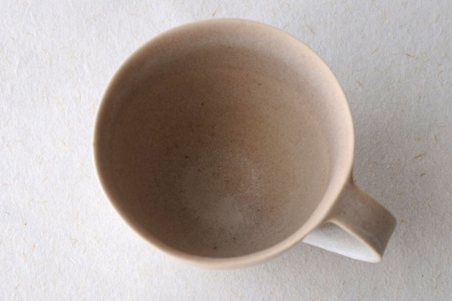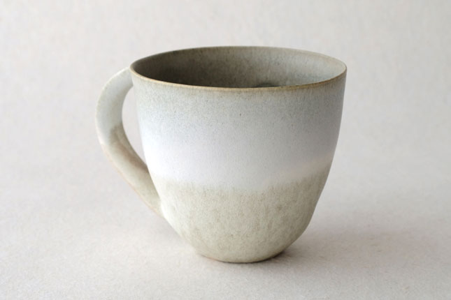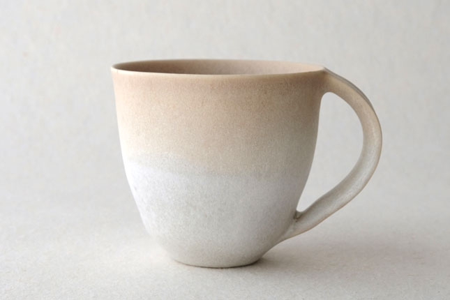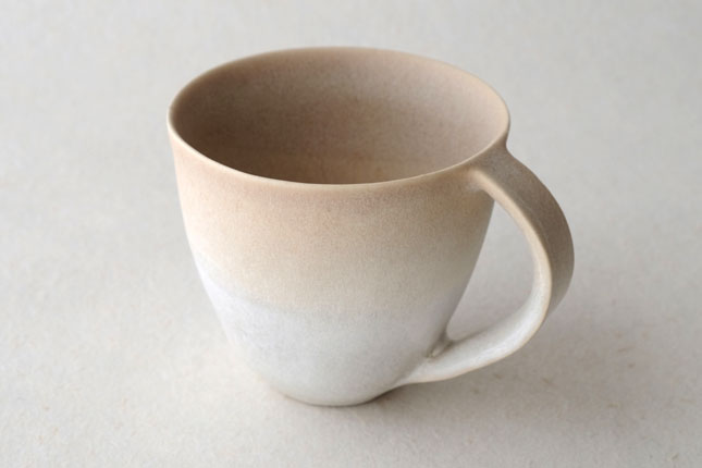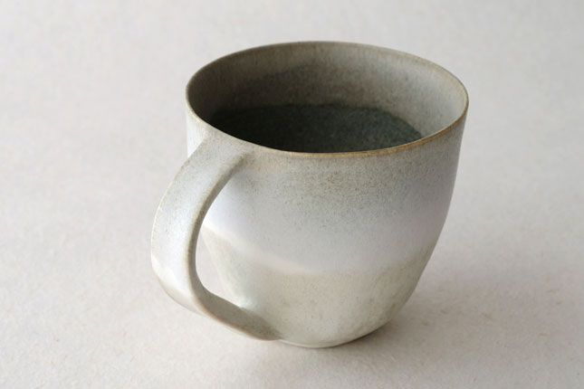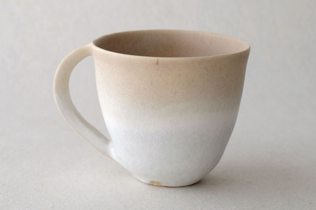 色の変化が美しいマグカップ。グラデーションは器のなかにもあり、飲み物を飲んでいるあいだもずっと楽しんでいただけると思います。型に粘土を押しあてて形を作られています。ご本人は型に押しあてることで生まれる独特のハリ感に惹かれているのだそう。