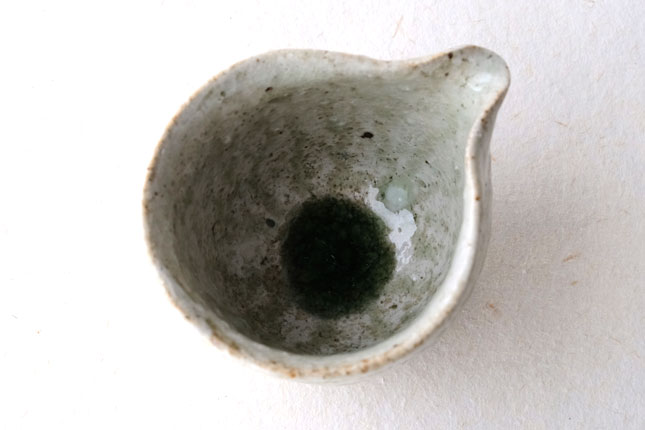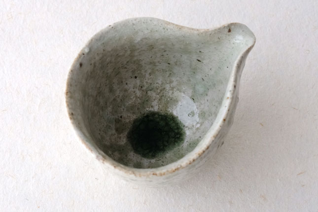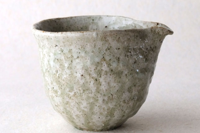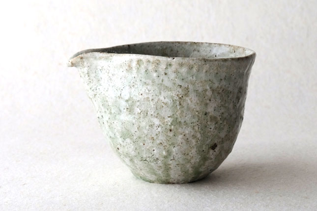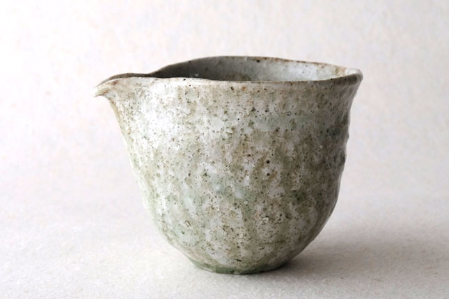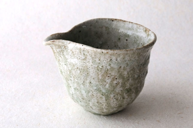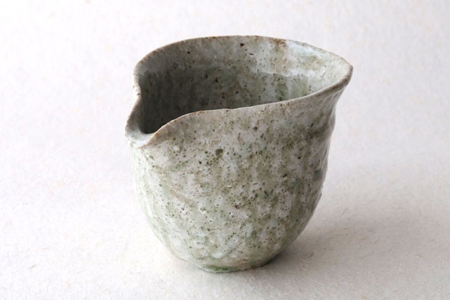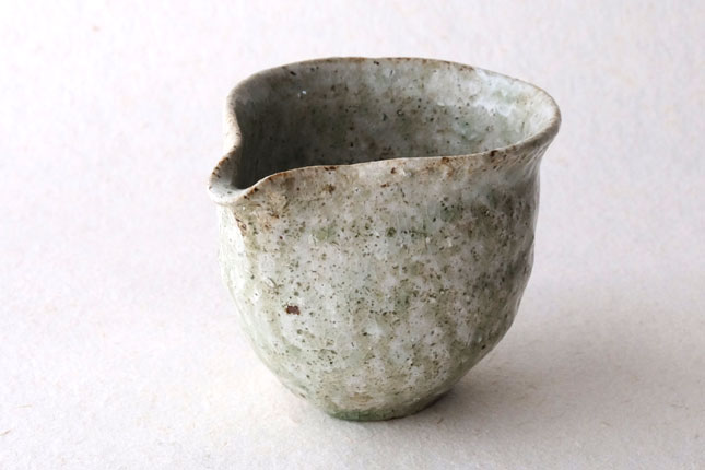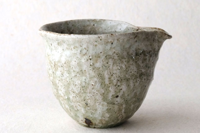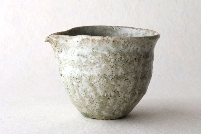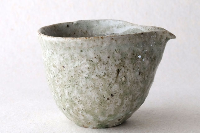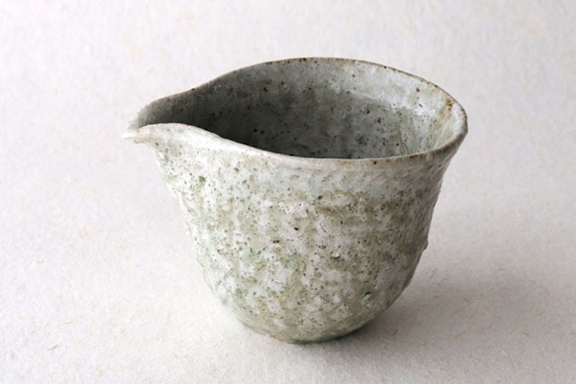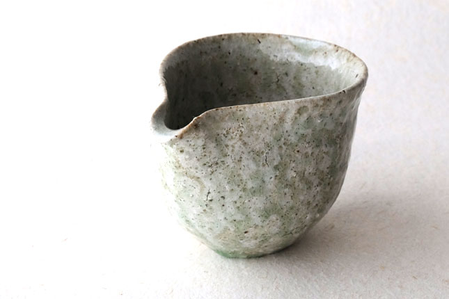 鶴見さんならではの、手びねりの技法をいかした独特の形です。縁の下がすぼまっていて片手でも持ちやすくなっています。お茶の湯冷ましとして、ぐい呑みとあわせて酒器に、ここでタレやドレッシングを作って道具のように使っても。